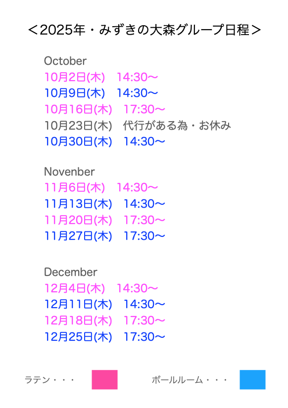 皆様こんにちは渡邉美寿希です 大森グループレッスンの開催日が少々分かりにくいと思い、、 以下の日程表を作りましたご確認下さいませ 介護施設様へ移動する日、駒込教室でオンラインがあったりと お時間固定で開催出来ずすみません ご興味のある内容に皆様ご参加頂けたら嬉しいです ピンクがラテンの日 / 青がボールルームの日ですのでご注意下さい。 ※急遽お休みになる日がありましたらご連絡致します。 ご参加お待ちしております About The Author渡邉美寿希社交ダンスは知れば知るほど面白い!楽しい!!人生を輝かせるスパイスとして、是非社交ダンスを体験しにいらして下さいお待ちしております!https://www.js-dance.com/specialist/detail7440/Follow :Recent Posted2025年11月21日BLOG今年最後・・・11月24日(月)B級ラテン競技会🔥2025年11月15日BLOG10ダンスが配信されるらしい件2025年10月29日BLOG味噌カツが美味しかった件2025年10月27日BLOG世界インターナショナルダンス選手権・名古屋インター行ってきました!!2025年10月17日BLOG明日は世界プロフェショナルダンス選手権大会!!@幕張メッセ2025年10月7日BLOG10月・充実した日々♪渡邉美寿希の記事一覧