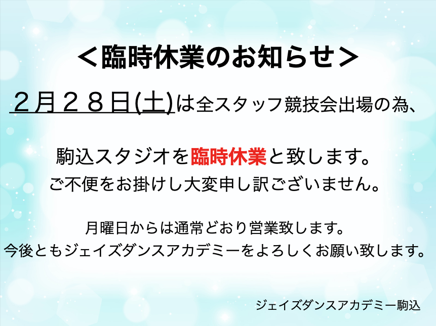 駒込校から【臨時休業のお知らせ】 2月28日(土)は全スタッフスーパージャパンカップダンスへ 出場する為【臨時休業】となります。 皆様にご不便をお掛けいたします。 ご用件のある方は以下へご連絡下さいませ↓ TEL: 03-6902-1019 へ留守番電話 Email: komagome@js-dance.com 3月2日(月)からは通常どおりに営業致しますので、 今後ともよろしくお願い致します。 About The Authorジェイズダンスアカデミー東京都内の大森・駒込に2校社交ダンス教室を展開しております。初心者様・経験者様問わずどなたでも大歓迎です!!私たちがご提供するのは、充実した毎日をおくるための喜びや生きがいです。私たちは、全ての人に喜びや愛を感じ、充実した毎日をお送りいただけるようなダンススクールを目指しております。https://www.js-dance.com/Follow :Recent Posted2026年2月4日BLOG駒込・月一プログラムのお知らせ2026年1月13日BLOG第46回東京ボールルームダンスアカデミー受賞者お知らせ✨2025年12月22日BLOGJ&Nクリスマスパーティーありがとうございました!!2025年11月20日BLOG11月・月2プログラムのお知らせ!2025年10月8日BLOG10/15(水)は有馬先生『SAMBA講座』月一プログラム!!2025年10月3日BLOG10月は、、、月2プログラムやります!!Byみずきジェイズダンスアカデミーの記事一覧