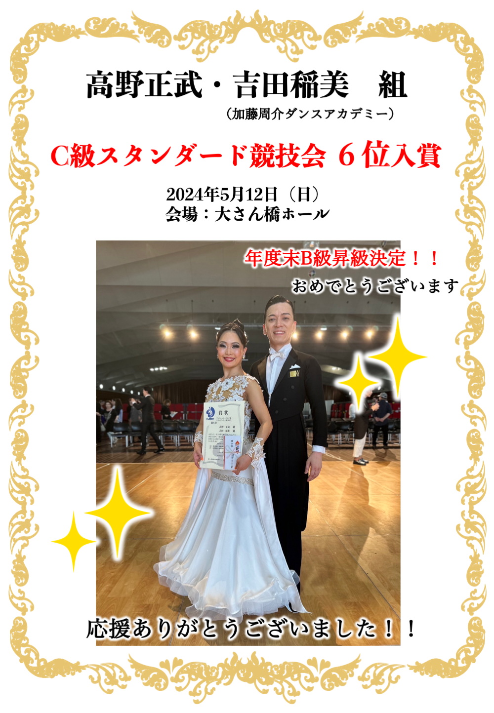 2024年5月12日(日)大さん橋ホールにて 今年2回目のC級ダンス競技会が開催されました たくさんの応援誠にありがとうございました 今回の結果は、、、 ●中島脩平(ハチヤダンスアカデミー)・渡邉美寿希 組 4位入賞🎉 ●高野正武・吉田稲美(加藤周介ダンスアカデミー) 組 6位入賞🎉 そしてさらに高野組は今回も決勝に入った為、年度末B級昇級が決定致しました 両組おめでとうございます🎊 2組とも年度末B級昇級が決まり素晴らしいです。 引続き応援の程宜しくお願い致します🤲